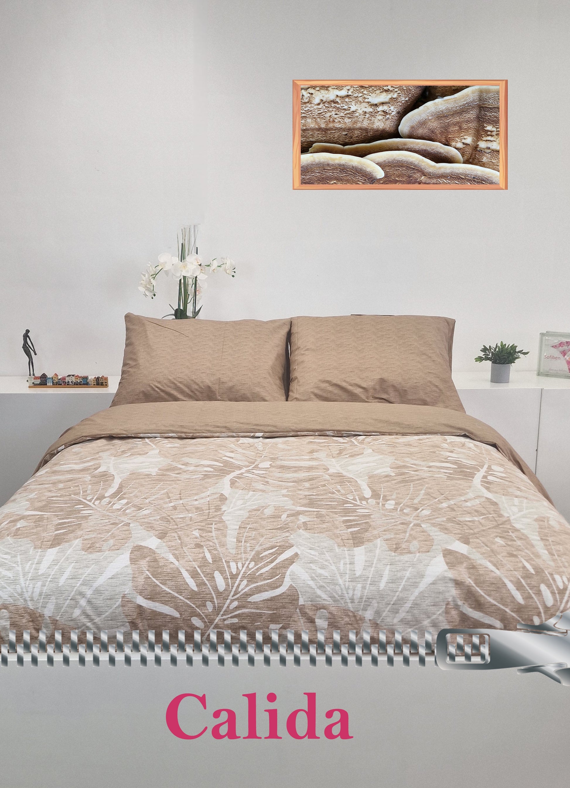 Het dessin Calida is een prachtig dessin. Het dessin zijn bladeren van de gatenplant en zijn subtiel op de stof geverfd. De kleurstelling is verschillende kleuren bruin ecru en grijstinten.