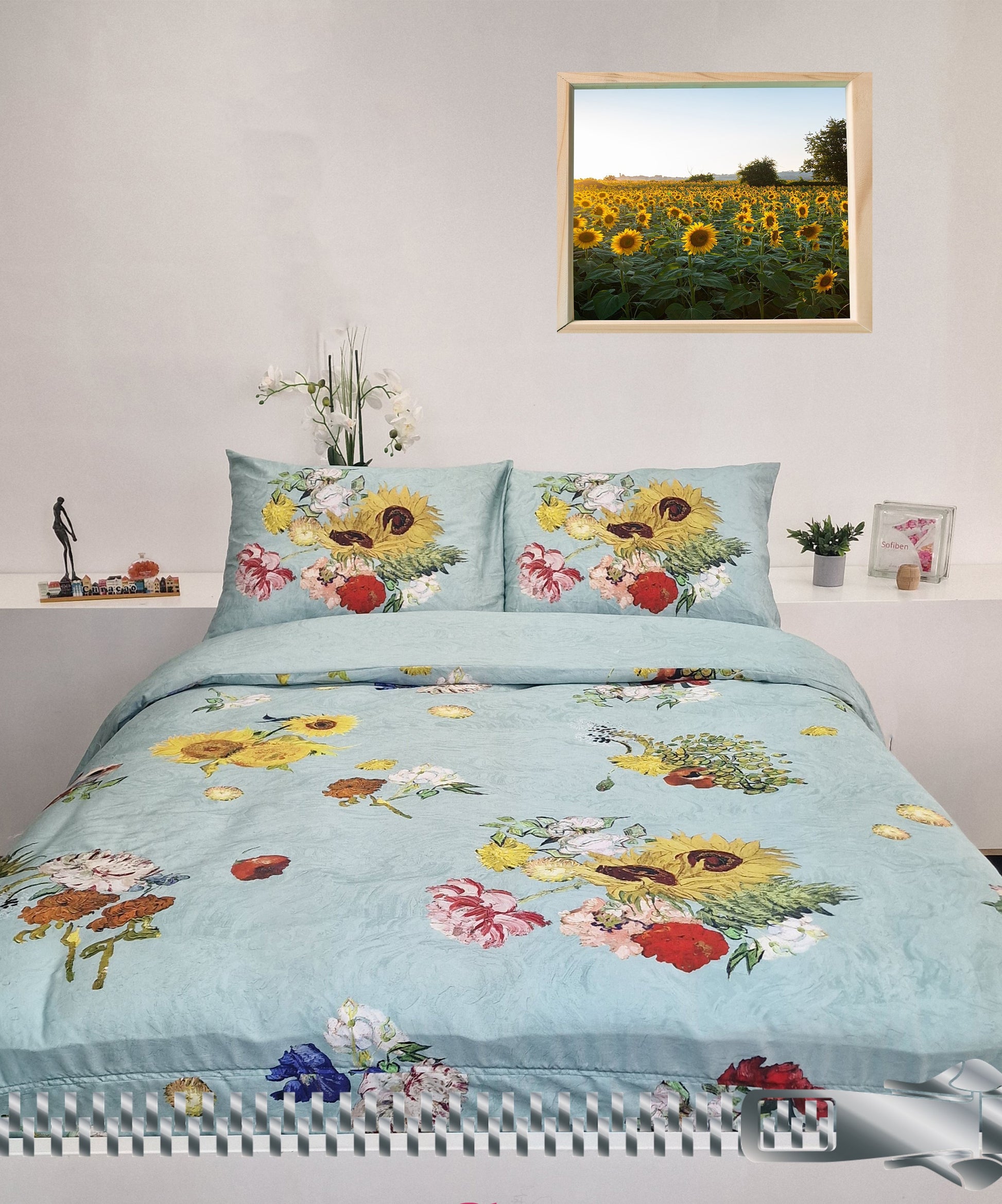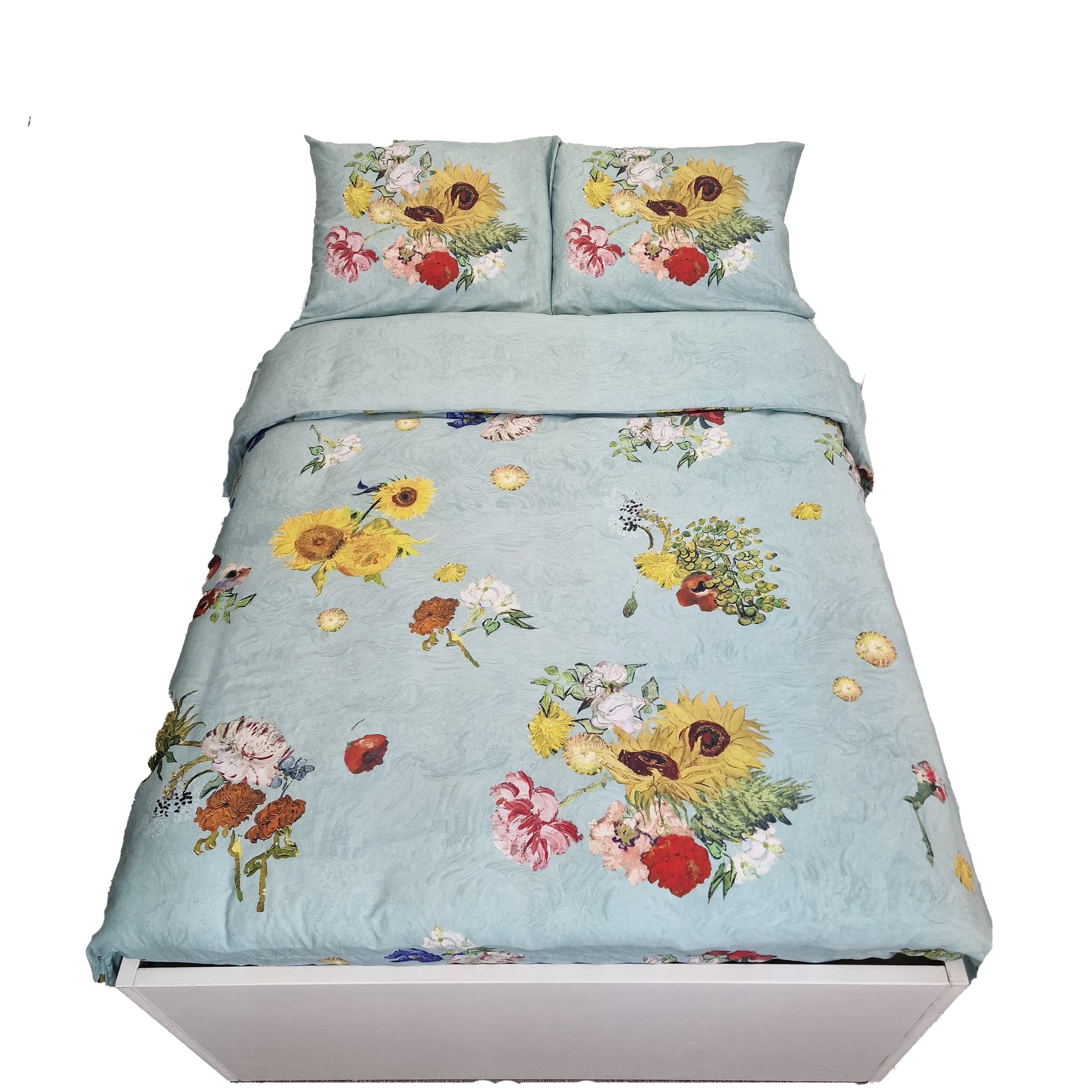 Het zijn bloemen op de wijze van van Gogh schilderkunst erop geprint op een turquoise ondergrond
